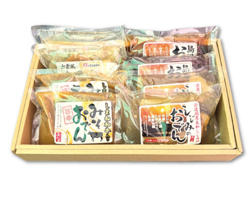 しまね和牛の牛すじを使用したみそおでん、宍道湖大和しじみの入ったしじみおでん、焼津産の鰹節・利尻昆布・焼きあごのだしを使用した出雲風おでん、のどぐろから丁寧に取った出汁を加えた島根のおでんの詰め合わせセットです。
